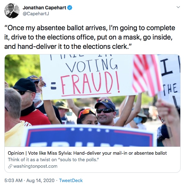 The President even appeared to admit in the tweet, that the terms “absentee” and “vote-by-mail” — which he had differentiated to justify his own absentee voting in the past — were interchangeable.