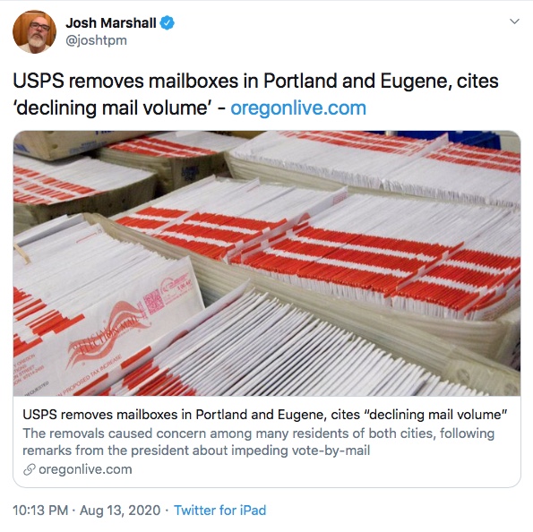 Trump’s USPS Puppet Mr. NO-Joy has removed some sorting machine and now removed mail boxes too!