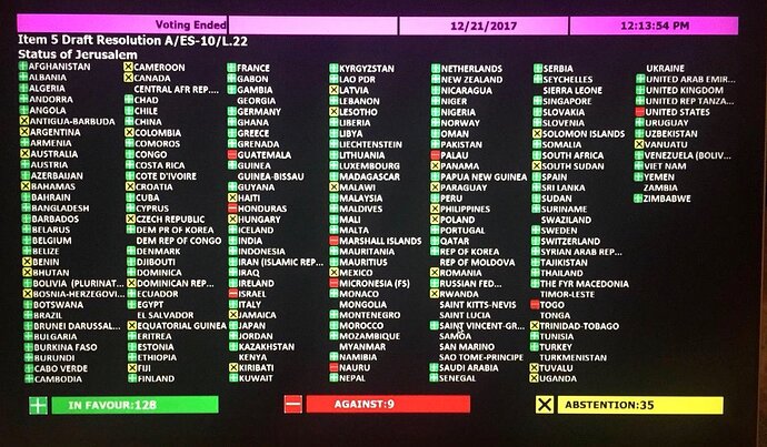 The nine countries voting “no” were the U.S., Israel, Guatemala, Honduras, Micronesia, Nauru, Palau, Marshall Islands and Togo. Among the notable abstentions were Australia, Argentina, Canada, Colombia, Croatia, Czech Republic and Mexico.