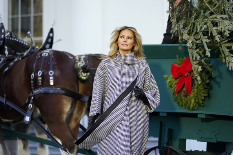 Mrs. Trump inspected the Fraser fir tree, smiled, waved to cameras and chatted with masked drivers of a carriage pulled by Clydesdale horses as the brass section of the U.S. Marine Band played Christmas carols.