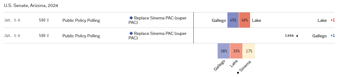 Not much high quality polling on this race yet, so Gallego could be correct that Sinema hurts him more than Lake. Either way, I have yet to see any poll where Sinema leads. She has a pretty clear choice between losing in an embarrassing third place finish or not running again. There is no way she makes it back into the Senate in 2024.