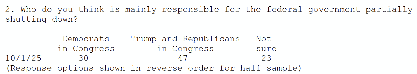 The Post’s poll finds significantly more Americans blame President Donald Trump and congressional Republicans for the shutdown than Democrats, though many say they are not sure. People express moderate concern about the shutdown’s impact at this early stage, with “somewhat concerned” the most common answer. A large majority support Democrats’ call to extend federal health insurance subsidies in general, though just under half support the party demanding this if it extends the government shutdown.