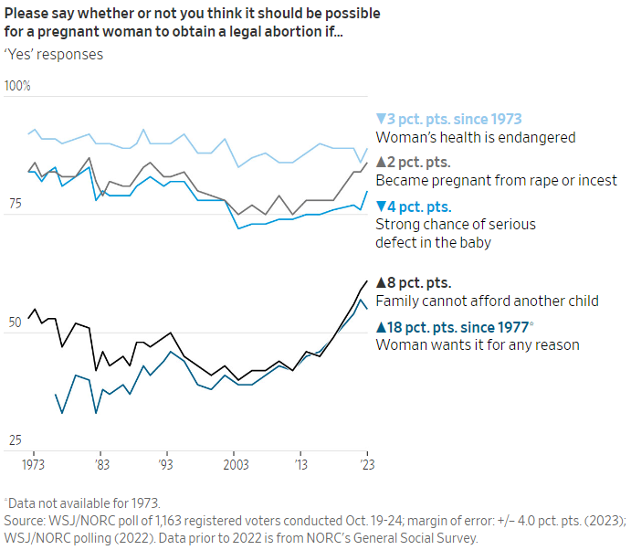 A new Wall Street Journal-NORC poll out today found that about 55 percent of those surveyed believe that women should have access to legal abortion for any reason, which, in the WSJ’s words is “one of the highest levels on record since nonpartisan researchers began tracking it in the 1970s.”