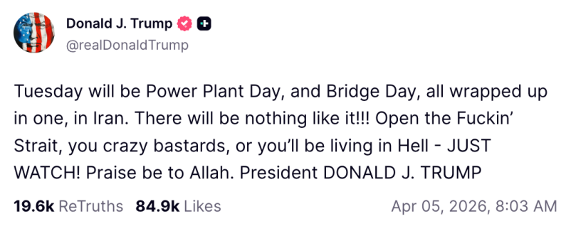 “We have a plan, because of the power of our military, where every bridge in Iran will be decimated by 12 o’clock tomorrow night, where every power plant in Iran will be out of business — burning, exploding, and never to be used again,” he said during a rambling press conference Monday, referencing his previous (supposed) ultimatum to Iranian regime leaders to reopen the Strait of Hormuz.