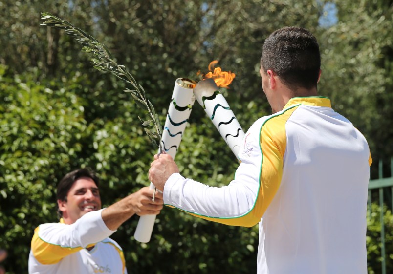 The first torchbearer, Greek world gymnastics champion Eleftherios Petrounias, took delivery of the flame and handed it to Brazilian former volleyball great Giovane Gavio at the beginning of a relay involving hundreds.